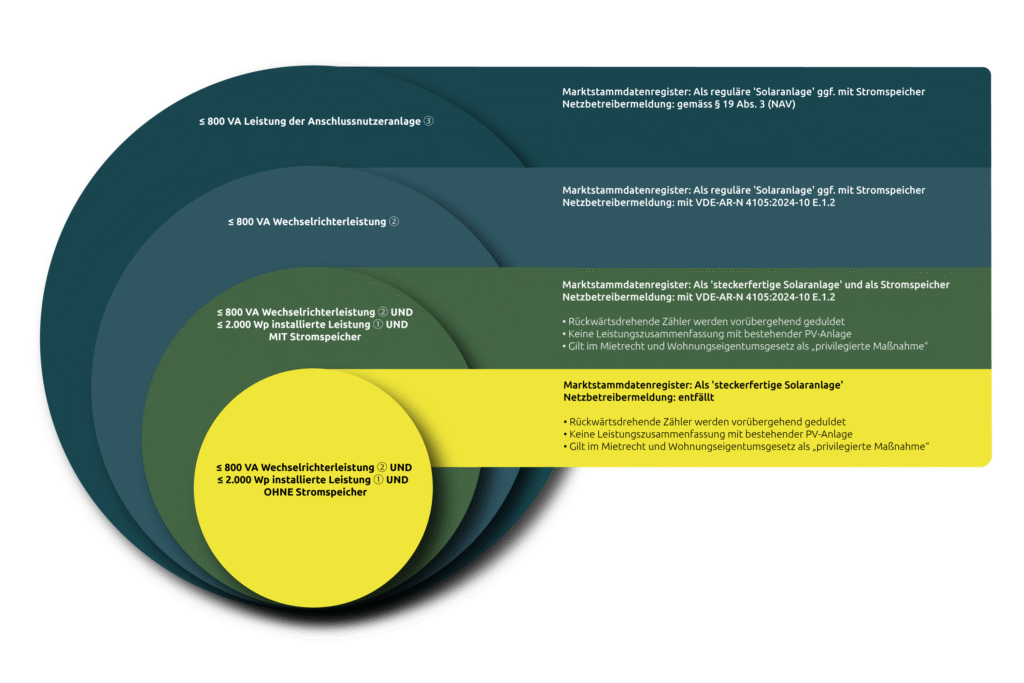 Nach VDE-AR-N 4105:2026-03 F.1.2 sind Netzbetreiber verpflichtet, Laienanmeldungen für Steckersolargeräte bis zu einer Netzrückwirkung ③ von 800 VA bzw. Watt zu akzeptieren. Wird diese Leistungsgrenze durch den Wechselrichter ② technisch sichergestellt, kann das standardisierte Formblatt VDE-AR-N 4105:2026-03 F.1.2 verwendet werden.